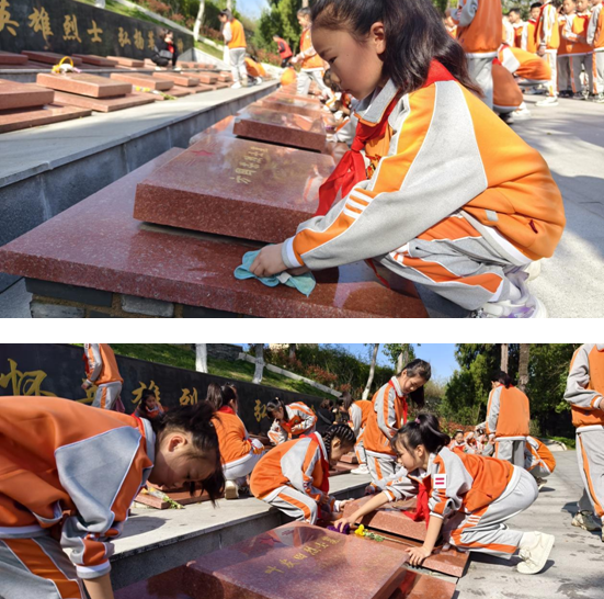 英灵不朽,忠魂常在。祭奠仪式结束,队员们来到烈士墓前,鞠躬致敬,俯身轻轻擦拭墓碑上的灰尘,以志愿服务的方式缅怀革命先烈。