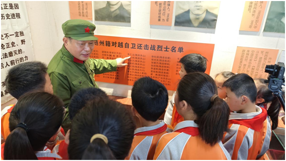 “同学们,你们现在看到的这名烈士名叫朱仁义,他在对越自卫反击战中壮烈牺牲……”革命烈士纪念馆里,队员们偶遇前来祭奠战友的老兵们,曾在老山战役中荣获二等功的老英雄给队员们讲述了朱仁义烈士在对越自卫反击战中的英雄故事。当听到年仅23岁的朱仁义烈士为了战斗的胜利牺牲时,队员们眼含泪花,目光久久的停留在朱仁义烈士的照片上,心里充满了崇敬之情。当听到老英雄在老山战役中荣立二等功时,队员们报以热烈的掌声,并用队礼向老英雄致敬。最后,队员们与老兵们在纪念馆前列队高唱国歌,嘹亮的歌声表达了对革命先烈的深切缅怀,是对伟大祖国的美好祝福,亦是对红色精神代代相传的延续。