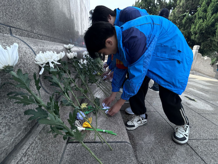 在庄严肃穆的革命烈士纪念碑前,全体师生向烈士鞠躬敬礼,敬献自己亲手制作的花束和千纸鹤,以表达对革命烈士的缅怀和哀思。随后,大家高昂歌唱《我们是共产主义接班人》。