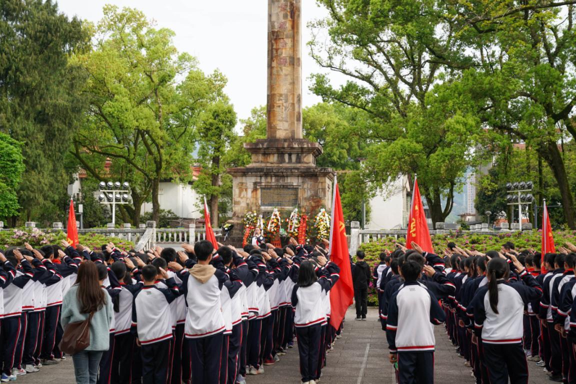 △4月1日,福建武夷山市少先队员在列宁公园闽北革命烈士纪念碑前宣誓。