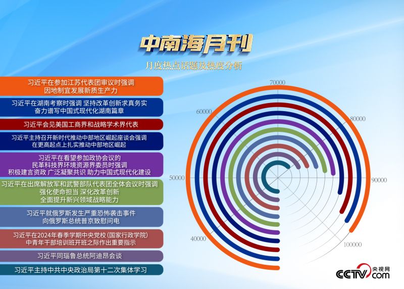 央视网“智闻”系统提取分析2024年3月全网时政新闻热点显示,“习近平总书记在湖南考察”“新时代推动中部地区崛起座谈会”等相关话题备受关注。