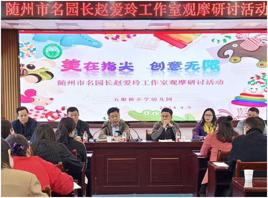 随州新闻网讯 (通讯员江波、赵爱玲)为立足园本教研,促进教师专业成长,提高幼儿园的保教水平,充分发挥名园长赵爱玲工作室在教师专业成长中的引领、辐射和示范作用。4月9日上午,随州市名园长赵爱玲工作室核心成员及工作室基地园的园长、老师们共计60余人在五眼桥小学幼儿园举行了美术特色课程观摩研讨活动。市、区继续教育中心、区教研室领导到现场进行了指导和点评。