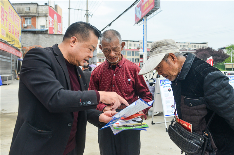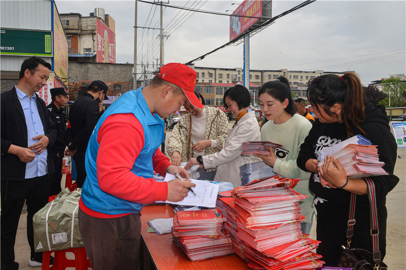 4月10日,曾都区淅河镇人民政府在该镇九通农贸市场前举办宪法宣传和扫黄打非宣传咨询服务活动,现场发放宣传资料1万多份。淅河镇司法所长孙建军等工作人员向群众讲行政复议法和宪法,让人民知法懂法,受到了群众的称赞。(通讯员 王涛摄)