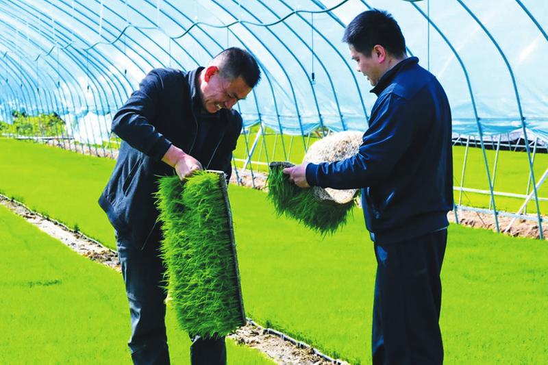 走进育秧大棚,目之所及一片新绿,秧苗像地毯一样铺陈开来,迸发出无限生机。
