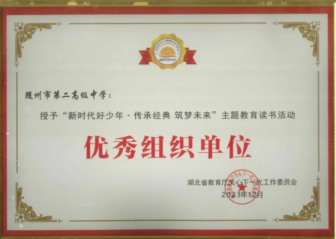 随州二中历来重视传承中华优秀传统文化,深入践行党的二十大精神,培育时代新人。继2022年省教育厅关工委授予该校全省“新时代好少年·强国有我”主题教育读书活动“先进集体”称号之后,近期,学校又被授予2023年 “新时代好少年·传承经典·筑梦未来”主题教育读书活动“优秀组织单位”。