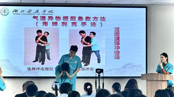 本次急救知识进校园活动,重点是对“心脏复苏”、“海姆利克急救法”等急救知识专项培训。工作人员们结合生活实际,创造施救情境,为学生讲解专业的急救操作方法,如气道异物梗阻急救术、心脏复苏和包扎伤口的方法。讲解过程中,医护人员们邀请学生上台体验,学生们积极参与。