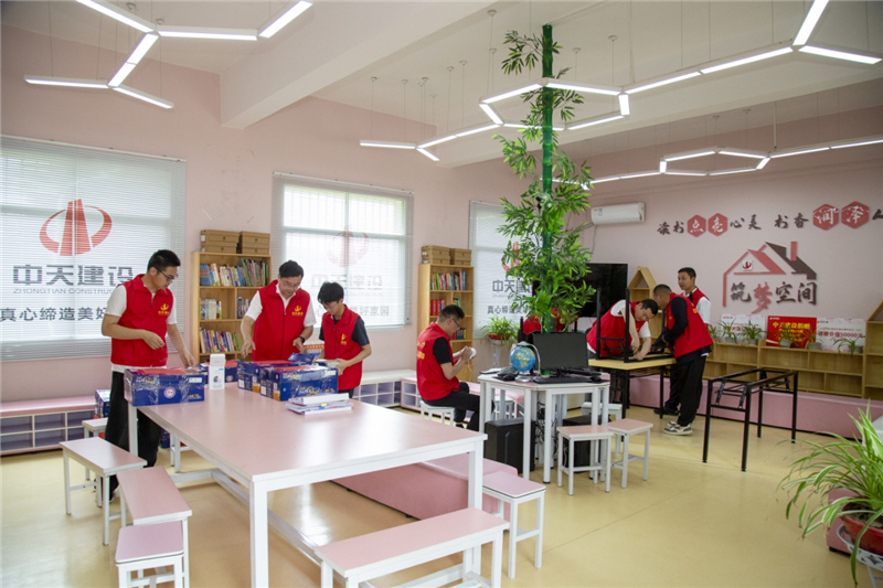 捐赠现场,中天集团爱心人士把一箱箱图书抬到阅览室,然后拆包、分拣。文学、科普、艺术、漫画……不一会儿,散发着墨香的新书分类摆上书架,在“读书点亮心灵,书香润泽人生”标语的映衬下熠熠生辉。每一本图书的传递,都是梦想的接力;每一次书籍的共享,都是温暖的漫溢。工作人员同时将捐赠的监控设备、图书阅览书桌安装到位。