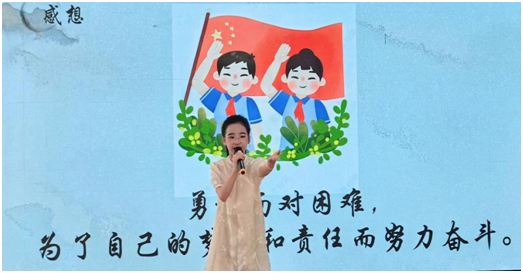 6名学生精心准备,充分显现出“腹有诗书气自华”的自信和风采。有的畅谈读书心得,推荐好书;有的赏名著、读经典,在阅读中与大师对话,故事和哲理娓娓道来;有的讲故事,时而饱含深情如清风拂面,时而激情澎湃如盛夏骤雨。一言一语皆流露出孩子们对读书的热爱。