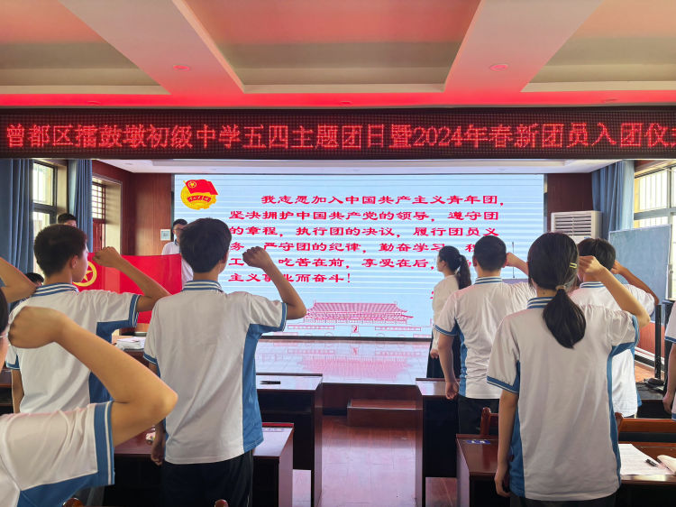 随州新闻网讯 (通讯员徐世喜、陈梦婷)为纪念五四运动105周年,进一步弘扬五四精神,强化共青团仪式教育,增强共青团员的先进性和光荣感,培养广大团员青年的组织意识和爱国意识,践行入团的初心使命,4月29日,曾都区擂鼓墩初级中学举办“青春奋斗正当时 挺膺担当向未来”暨2024年新团员五四入团仪式集中示范活动。