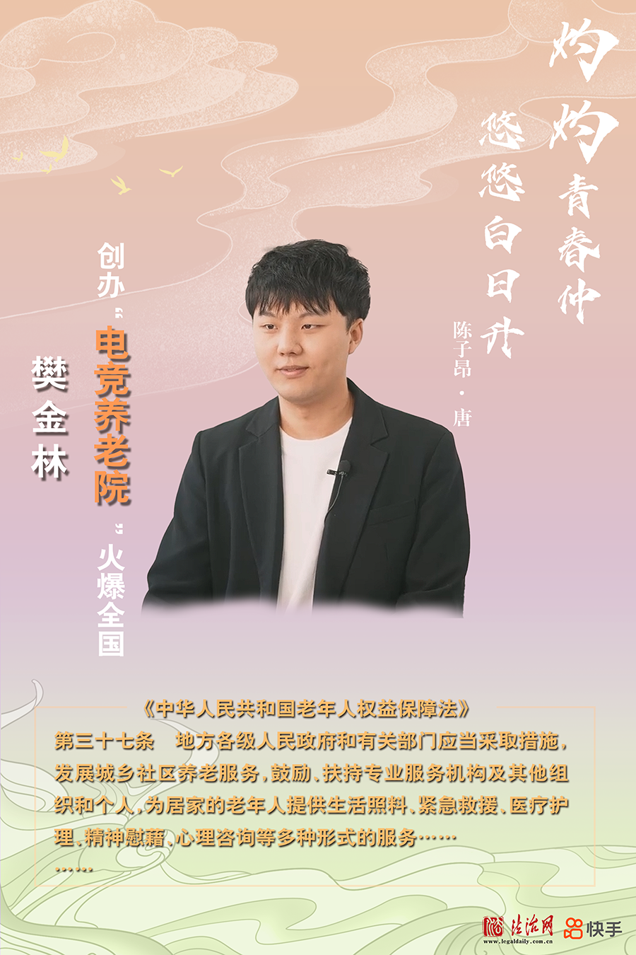 1997年出生的河南小伙樊金林(艺名:林烧)在河南省许昌市经营了中国首个“电竞养老院”。他把年轻人里流行的电竞、蹦迪、桌游等带进养老院,还带老人们一起拍摄短视频,通过在社交平台记录他们日常生活的点滴,让越来越多的人了解到“原来老年生活还可以这样有趣”。
