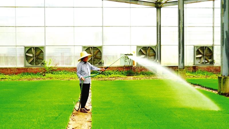 “传统育秧模式,完成一栋大棚的摆盘、上土、播种、覆土等工作,需9人每人8小时工作量;通过育秧中心的自动精密播种流水线,再到棚内叠盘的摆放,仅需3人就可完成。”肖世宝介绍,今年花费20多万元引进自动化流水生产线,该生产线通过传感器进行数控管理,只需要几十秒的时间就可以完成育秧的所有环节。每天出盘量在7000盘左右,可以栽种30亩水稻,配合滴灌技术,整体出芽率达到98%。