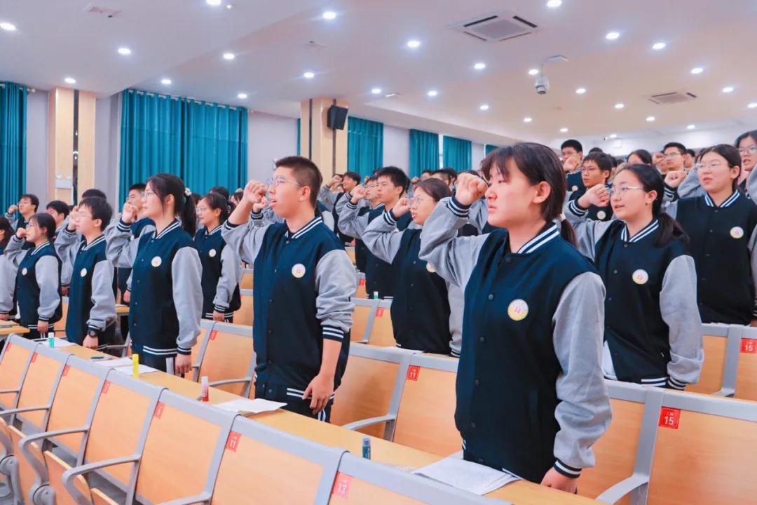 全体新团员面向团旗起立,举起右拳庄严宣誓,新团员们用铮铮誓言表达他们的决心,以一份铿锵有力的承诺,立志为共产主义事业而奋斗。