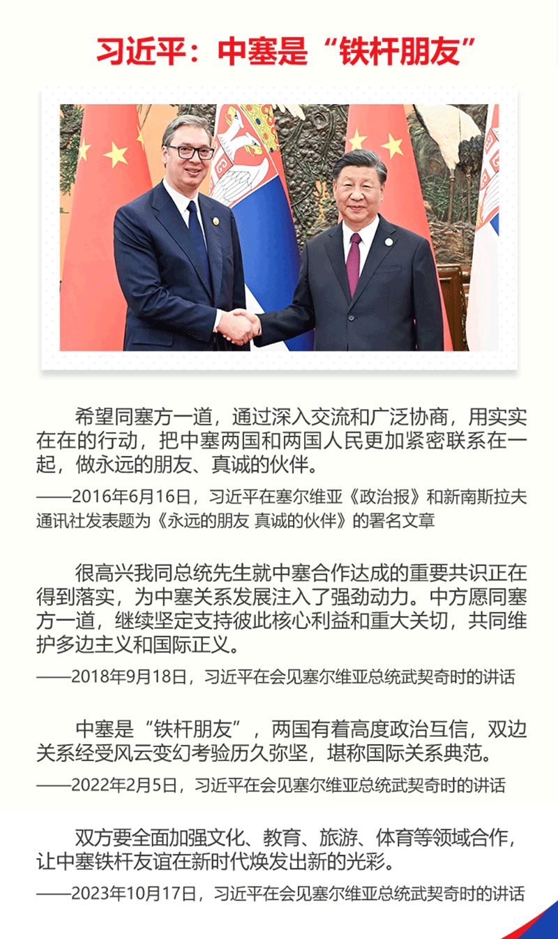 这是时隔近八年,习主席再次对塞尔维亚进行国事访问。中塞是“铁杆朋友”,习主席指出,希望同塞方一道,通过深入交流和广泛协商,用实实在在的行动,把中塞两国和两国人民更加紧密联系在一起,做永远的朋友、真诚的伙伴。