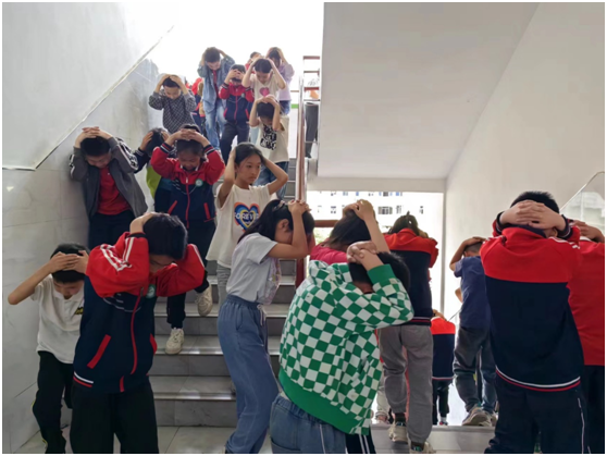 5月11日下午1点半,一阵急促的警报声在校园响起,400多名学生在上课老师的组织下立即排队迅速下楼,同学们弯腰抱头有序地撤离到安全地带,整个过程只用了1分40秒。