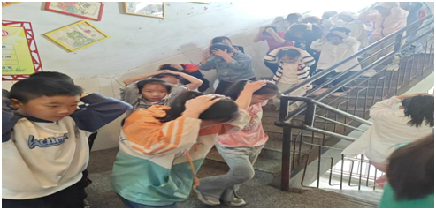 随着"注意,地震,请就地避震”,广播响起口令,学生迅速蹲下,躲在课桌旁,并用书包或书本保护头部。约1分钟后,"安全撤离"口令响起,各班学生都在班主任和科任老师的指导下疏散到指定的"安全地带”。