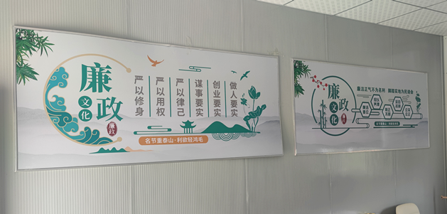 廉洁文化是思想层面的自觉和清醒,离不开良好的环境熏陶。在二号渠项目部,立着一面廉洁文化墙,廉洁文化墙融思想性、可读性、教育性、观赏性为一体,一幅幅图文并茂、寓意深刻的廉洁警言警句展板,既让人赏心悦目,又给人以警示,让职工在潜移默化中接受廉洁文化熏陶,接受近在咫尺的廉政教育,自觉做到清白做人,清醒做事,筑牢廉洁从企“防火墙”。