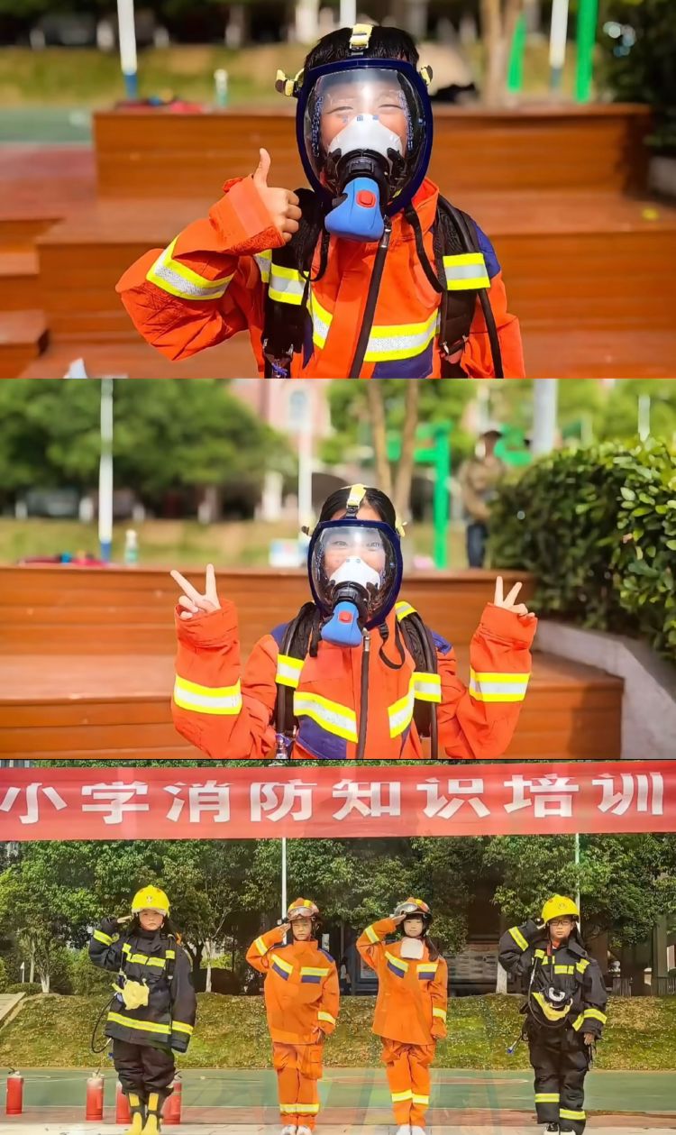 经过系统讲解后,孩子们直击演练,迅速撤离。随着警报声的拉响,各班教师按照应急预案的疏散线路,带领队员们捂住口鼻、弓起腰背,快速有序下楼。到达指定安全区域后,各班教师及时清点人数,确保没有一人遗漏,无任何意外发生。讲解并示范了灭火器的正确操作方法,牢牢记住了灭火器“一提、二拔、三握、四压”的使用步骤口诀。“蓝朋友”们还邀请孩子们试穿防护“战斗服”,防护帽、战斗服都穿戴得整整齐齐!