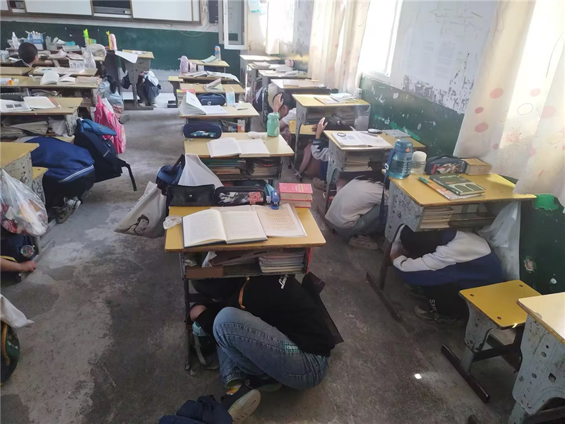 按照学校应急疏散演练的预案,演练活动首先通过广播发出第一遍地震预警信号,各班班主任迅速组织学生进行室内抗震避险,并指挥学生迅速抱头、躲在桌下,尽量降低身体重心,并尽可能保护头部。随后发出第二遍地震警报信号,全校教职工及时到达自己所在的指定位置,在教学楼内引导学生弯腰护头快速穿过楼道,有序撤离到操场指定地点。整个过程学生能够按照要求保护自己的头部,沿着预案中的路线向指定地点快速前进,有序撤离到安全地带。