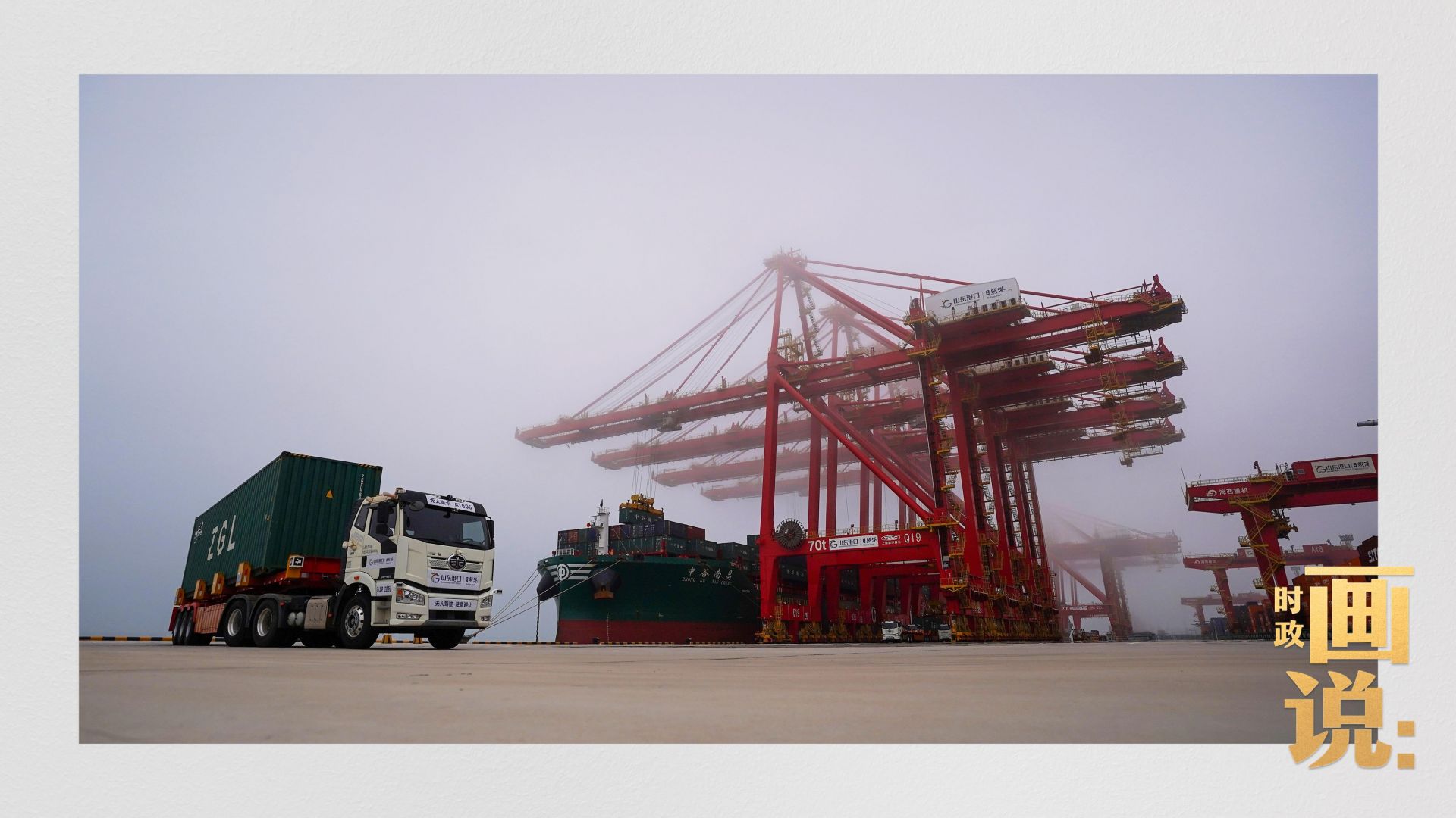 △山东港口集团日照港顺岸开放式全自动化集装箱码头,无人集卡车在运送集装箱。