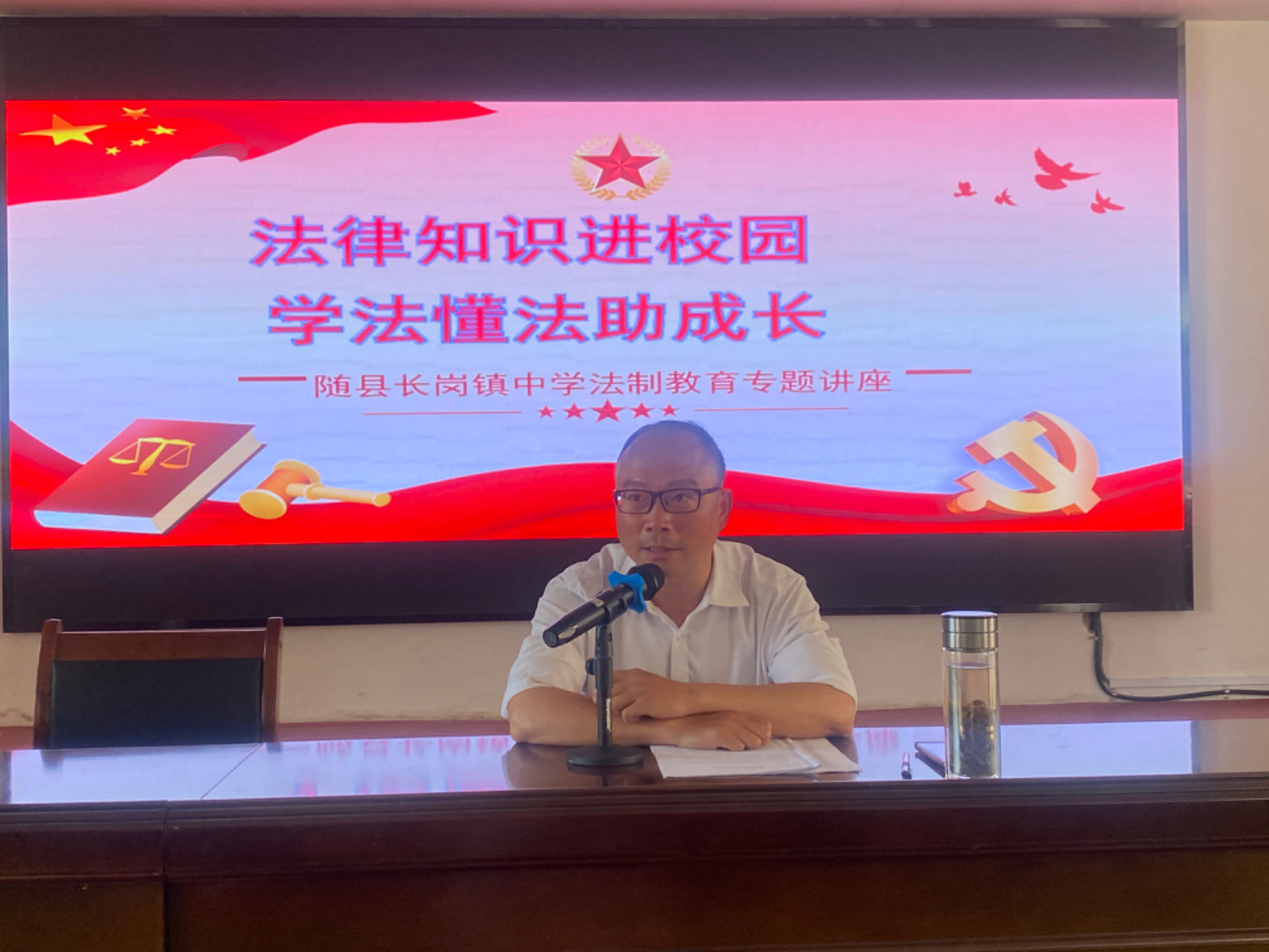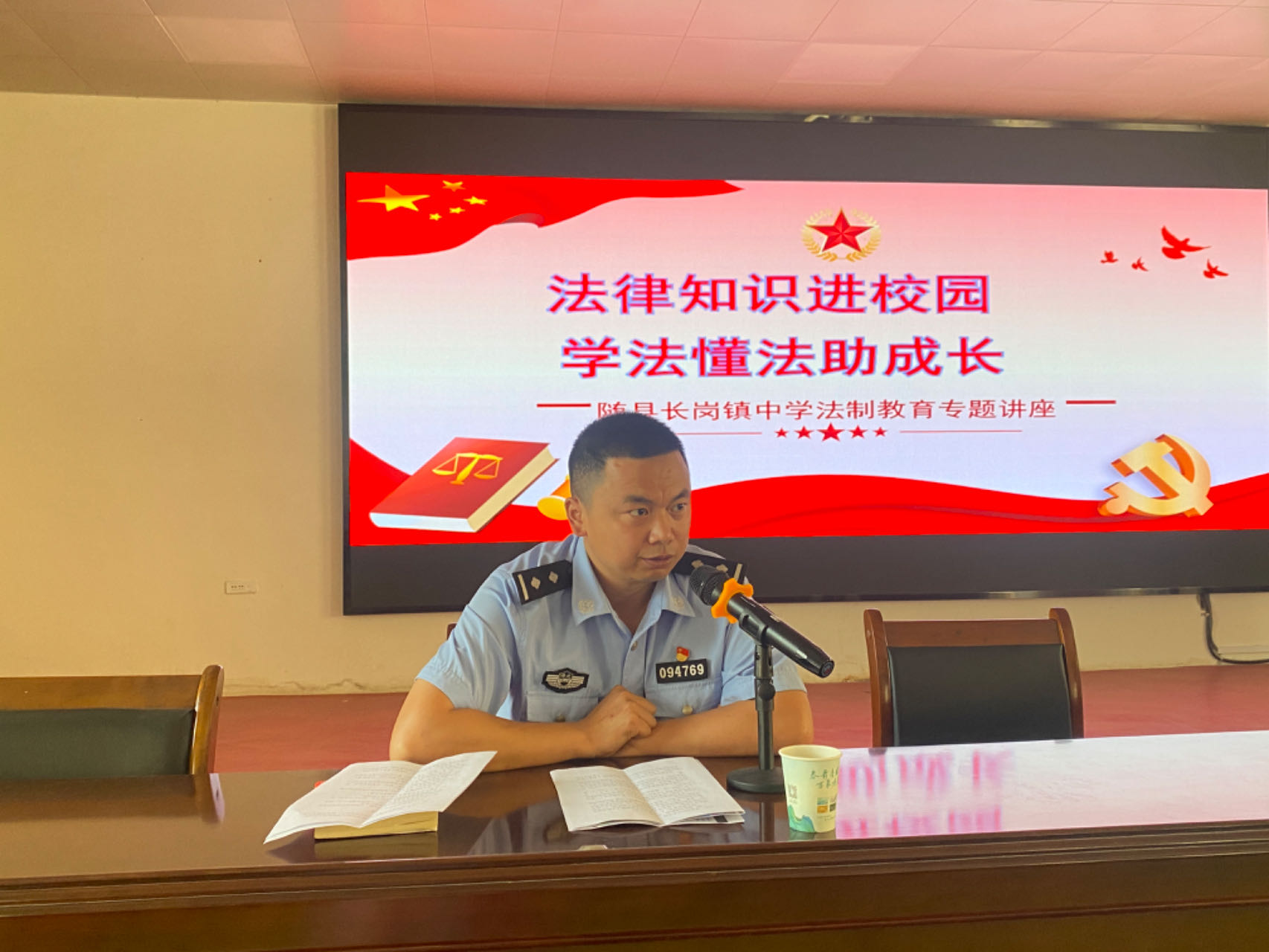 随州新闻网讯 (通讯员涂天月)5月23日下午,随县长岗镇中学邀请法治副校长刘印、派出所民警张震为七年级学生开展了一场法律知识专题讲座。