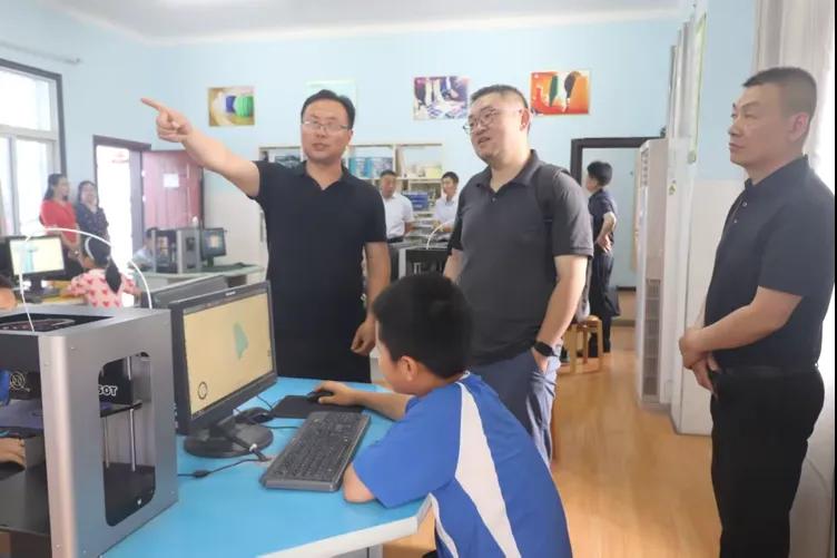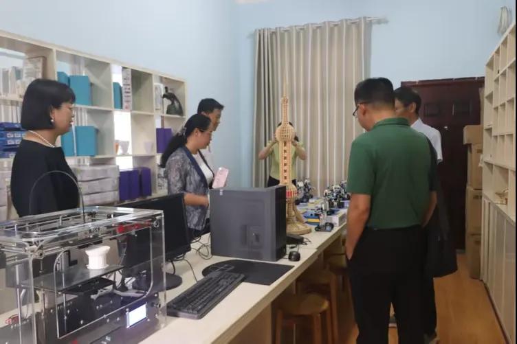 在实验室,学生正在上科学实验课,专家组查看了实验设施、实验开展情况,亲切地和师生们进行交流。在录播室,专家组观摩了录播室的全新设备,询问平时学校教研活动的展开形式。在3D打印室,专家组参观了学生现场打印3D作品的过程。在创客营社团中,老师正在教学生快速地将魔尺变换造型。