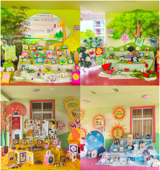 为了此次艺术节活动,老师们带领幼儿,发动家长,精心制作出具有奇思妙想且富有创意的美术作品,展台以“四季”为主题,丰富多彩的作品灵动活泼,充满生活气息,富有童趣和生命力,让观众深深地感受到童年的快乐和美好!