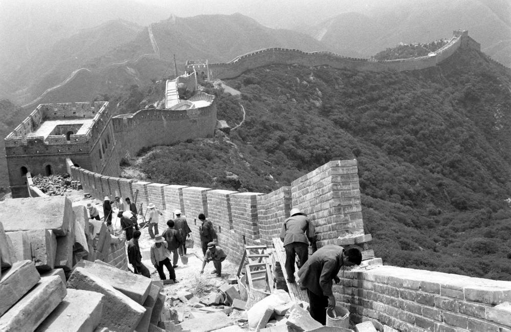 工人正在修复北京八达岭长城的一段城墙。这是用由北京晚报、八达岭特区办事处等单位联合发起“爱我中华 修我长城”社会赞助活动所获款项进行修复的第一期工程 (资料照片,1984年8月11日发)。新华社记者 袁汝逊 摄