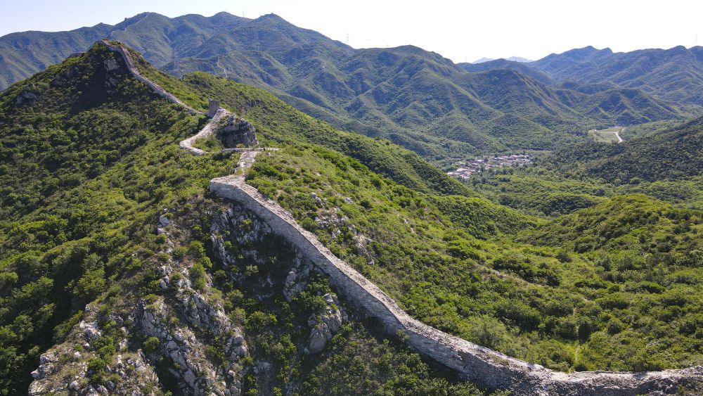 石峡关长城和长城脚下的石峡村(2024年6月1日摄,无人机照片)。新华社记者 陈钟昊 摄