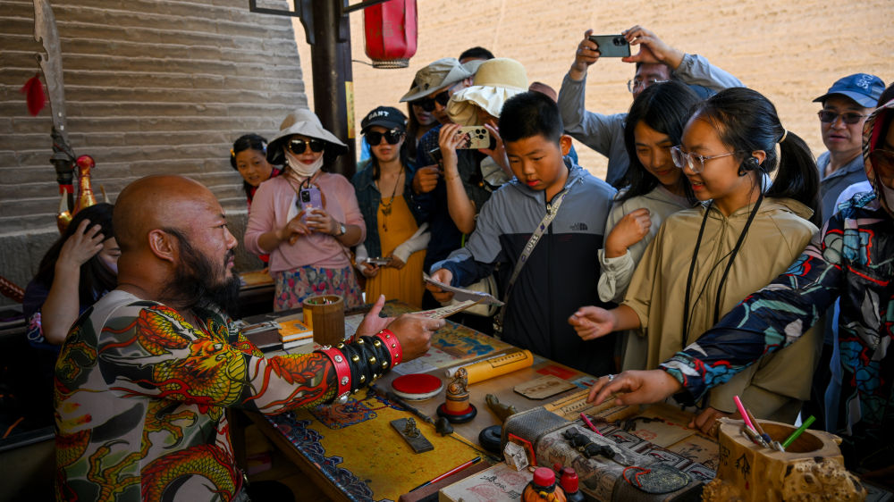 在甘肃嘉峪关关城景区,网红“关长”李森(左)为游客奉上自己手写好的文创产品“关照”(2023年7月14日摄)。新华社记者 刘金海 摄