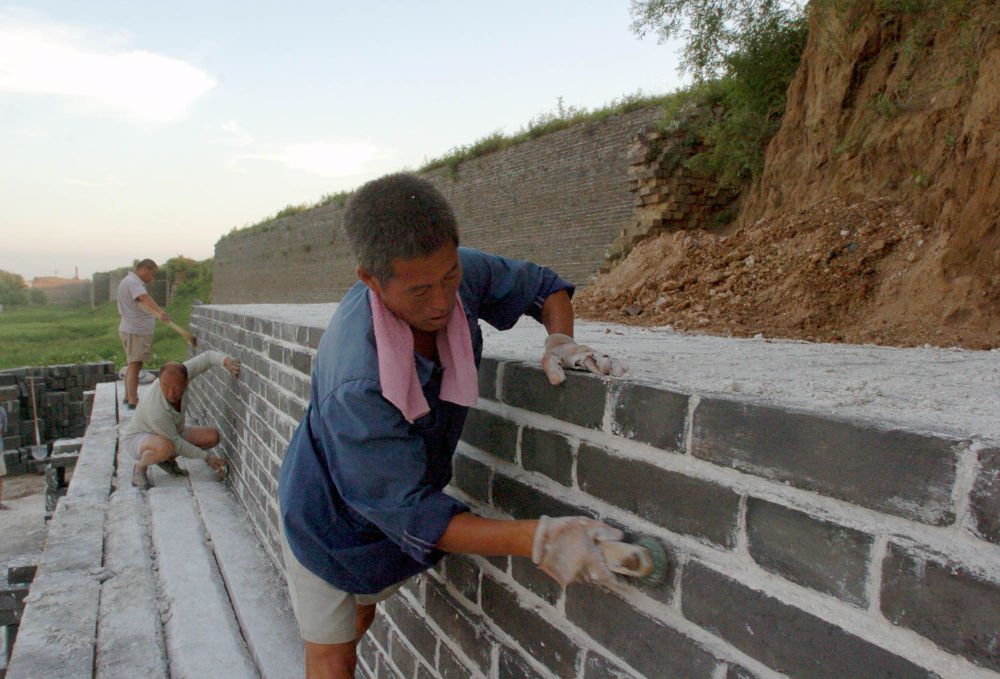 古建工人在修复山海关古城城墙(2005年8月29日摄)。新华社发