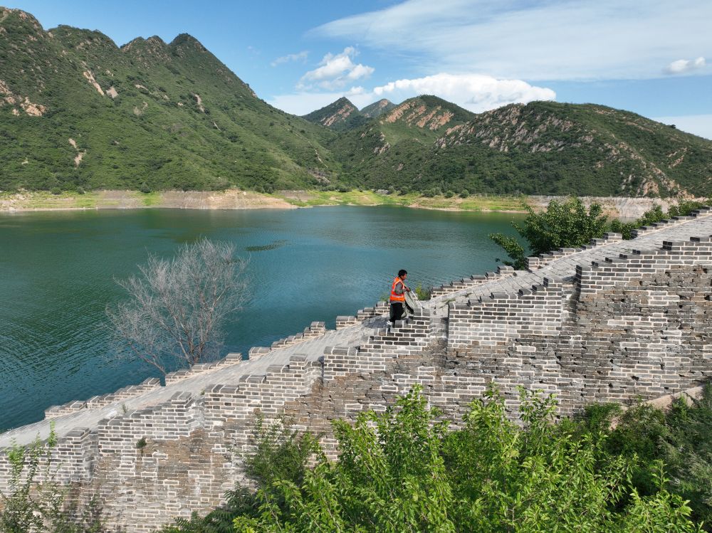 长城保护员衡丙三在长城上巡查。59岁的衡丙三是河北省唐山市迁西县喜峰口二村的长城保护员,负责守护喜峰口西潘家口段古长城(2023年8月30日摄)。新华社记者 牟宇 摄