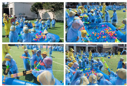 老师们也按捺不住激动的心情,纷纷拿起水枪,加入了打水仗的队伍中,和孩子们你追我打,场上热闹非凡!