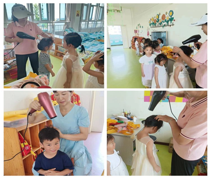嬉水的游戏满满的都是欢乐,在孩子们意犹未尽的欢笑声中,本次玩水活动接近尾声。活动结束后,老师们细心的为孩子们擦干身体、吹干头发,换好衣服。