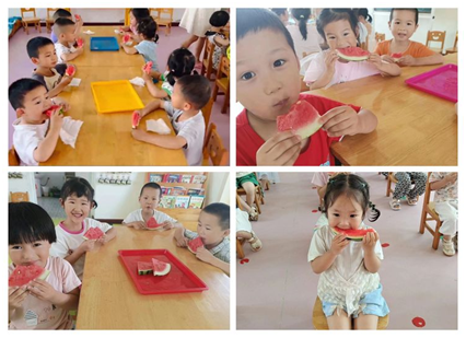 园长妈妈为小朋友们准备了甜甜的西瓜,小朋友们一起分享这份属于夏天的甜蜜。