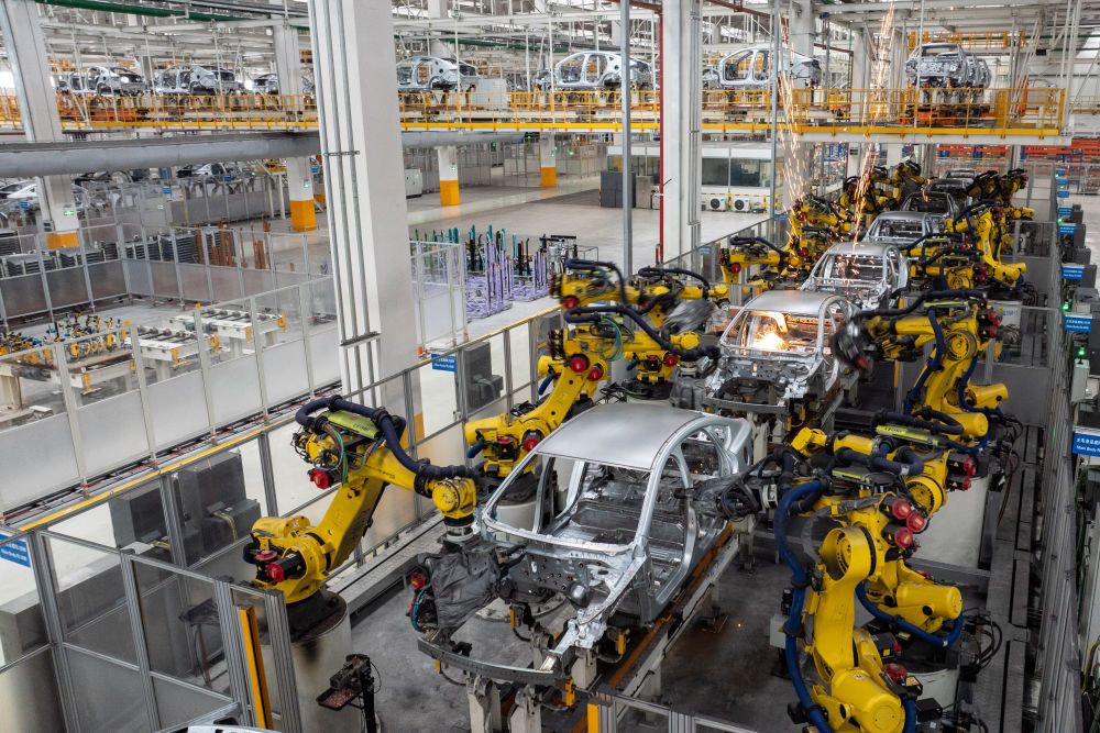 2024年3月21日,比亚迪湖南长沙雨花工厂机械臂在焊接车身。