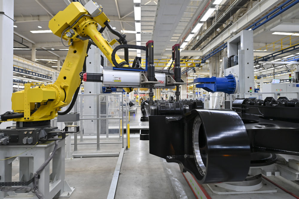 2024年4月9日,在山西太原太重集团智能高端液压挖掘机产业园区,智能装配机器人在智能生产线上作业。