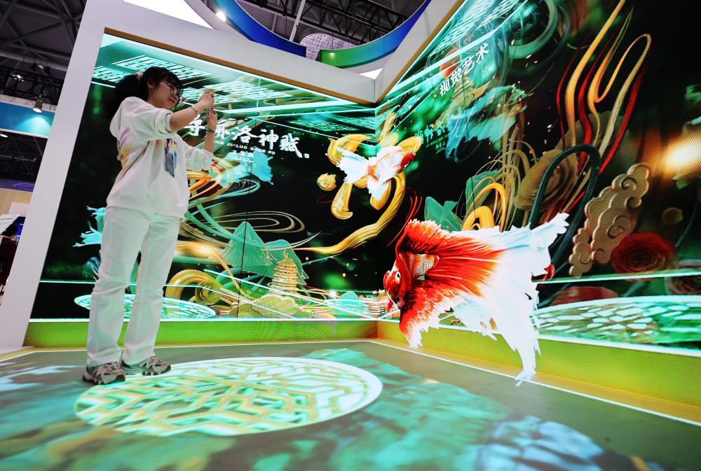 2024年4月1日,一名观众在安徽合肥举办的2024国际显示技术大会上体验合肥京东方展出的一款裸眼3D快速拆装折角屏。目前,新型显示产业在安徽已形成全产业链布局。