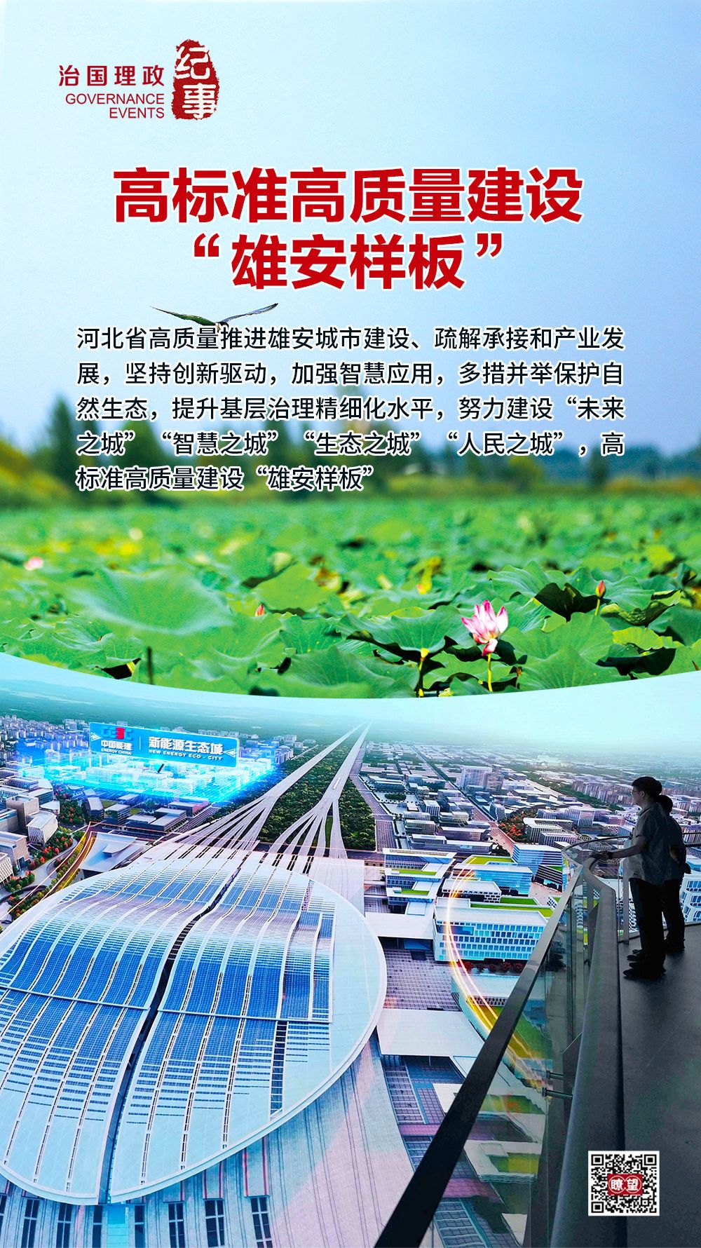 ◇围绕高标准高质量要求,河北省高质量推进雄安城市建设、疏解承接和产业发展,坚持创新驱动,加强智慧应用,多措并举保护自然生态,提升基层治理精细化水平,努力建设“未来之城”“智慧之城”“生态之城”“人民之城”,高标准高质量建设“雄安样板”。