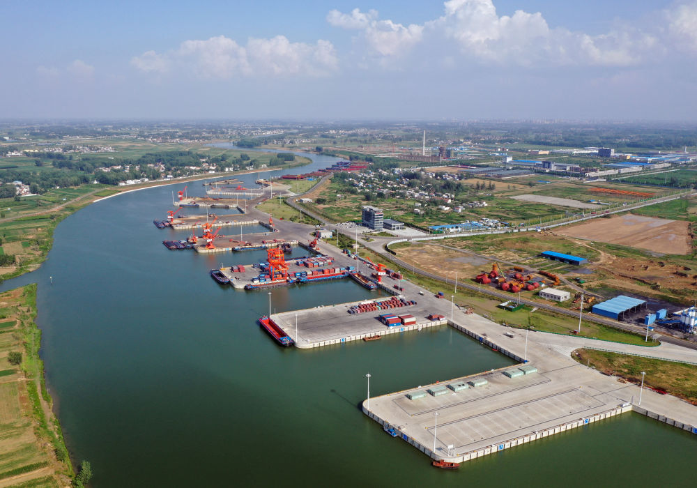 2022年6月28日拍摄的河南周口中心港码头(无人机照片)。近年来,河南积极推进沙颍河航道升级改造,疏通内河航运。现在,从周口中心港出发的船舶可经沙颍河至淮河、京杭大运河驶入长江,让内陆城市亦能通江达海。