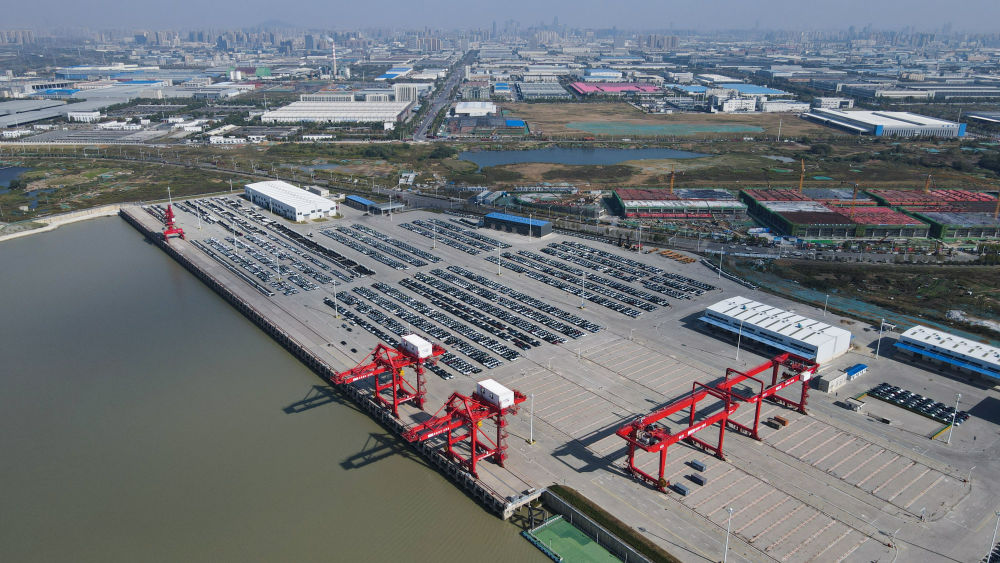 这是2022年10月11日拍摄的安徽合肥派河国际综合物流园港区码头(无人机照片)。依托连通长江与淮河的江淮运河,2023年7月,占地6000多亩的合肥生产服务型国家物流枢纽获批。以派河港为圆心,半径5公里范围内布局了3个整车基地;半径10公里范围内,覆盖了合肥七成的先进制造业企业,工业总产值超7000亿元。
