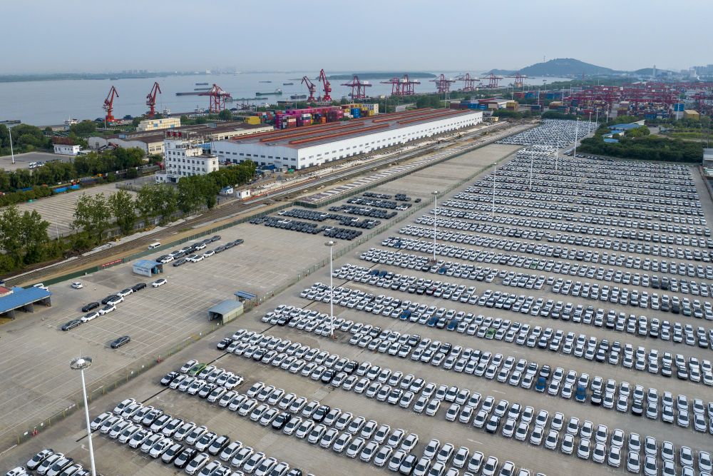 2024年5月26日,在安徽芜湖港朱家桥港区国际集装箱码头,整齐排列的汽车等待出口(无人机照片)。作为安徽省首个国家一类开放口岸,芜湖港现已发展成为长三角城市群综合交通运输体系的重要枢纽。
