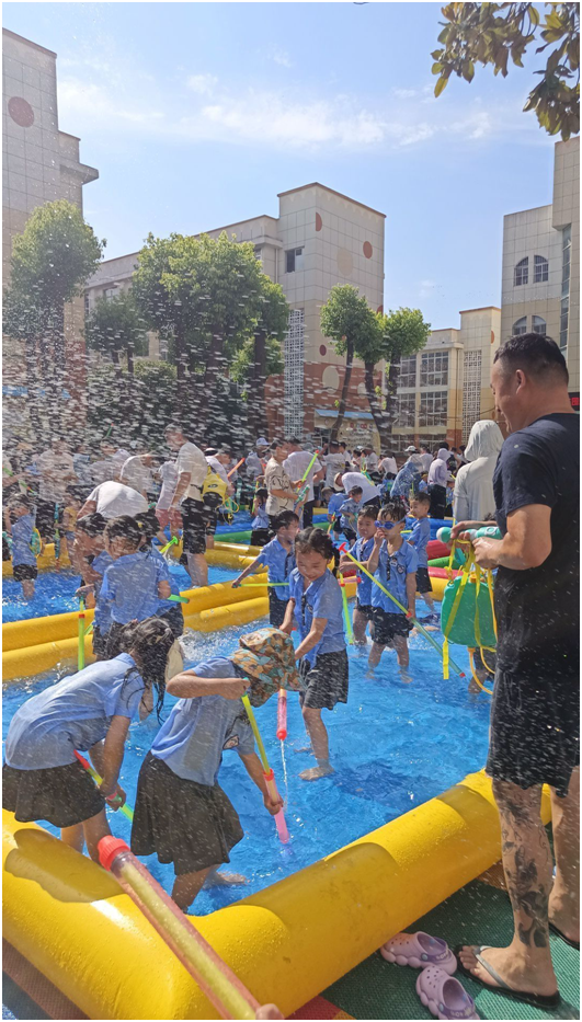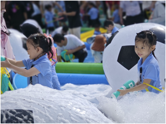 水枪、泡沫机、充气池,各种玩水工具已经万事俱备。一群小可爱,迫不及待的进入水中撒欢儿,大水抢、小水枪齐刷刷举起,一时间“风起云涌”。