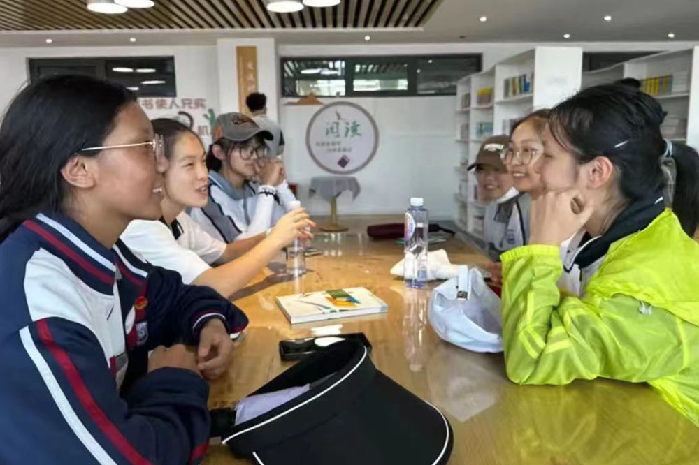 2023年7月10日,在果洛西宁民族中学,上海市大同中学学生(右)与果洛西宁民族中学学生交流。新华社发(果洛州教育局供图)