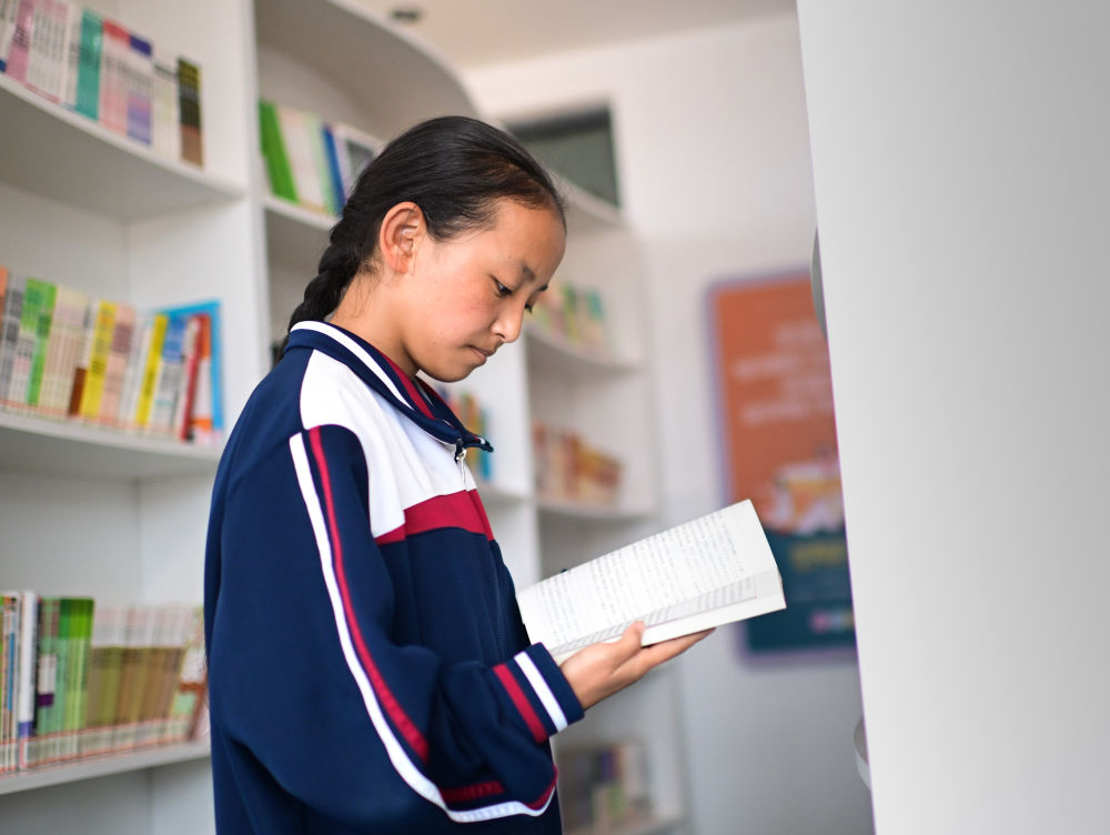 2024年6月18日,果洛西宁民族中学学生尼东拉毛在图书室看书。