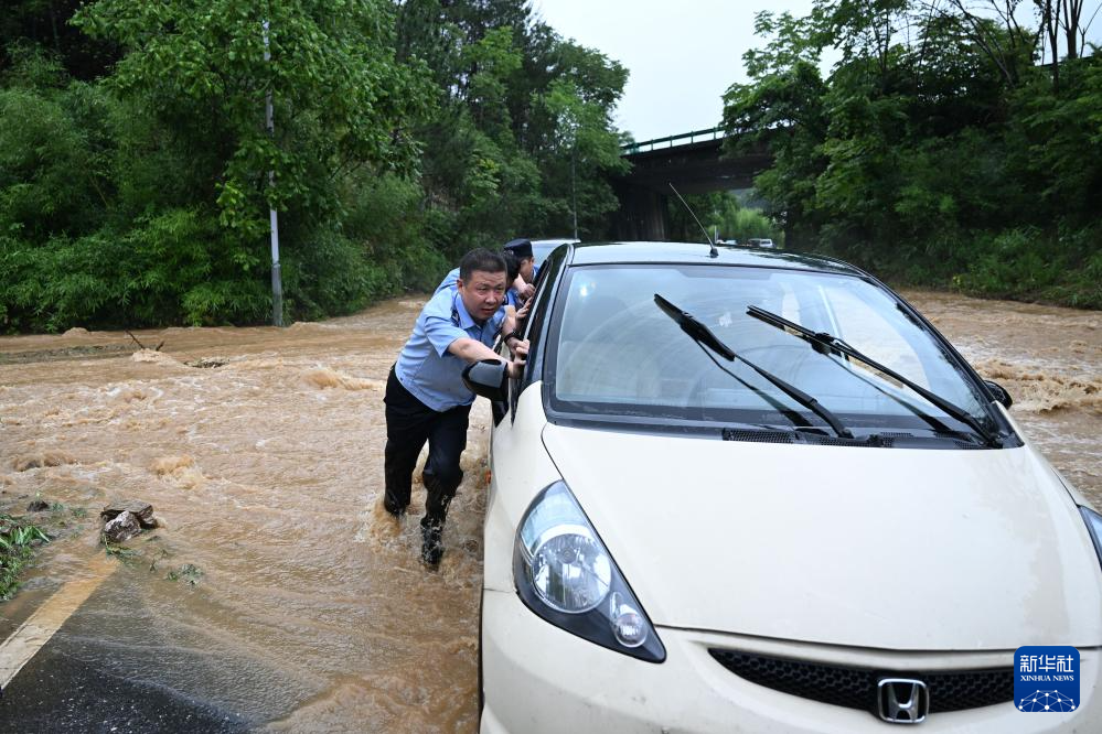 6月20日,在黄山市徽州区呈坎镇,民警帮助转移涉水车辆。