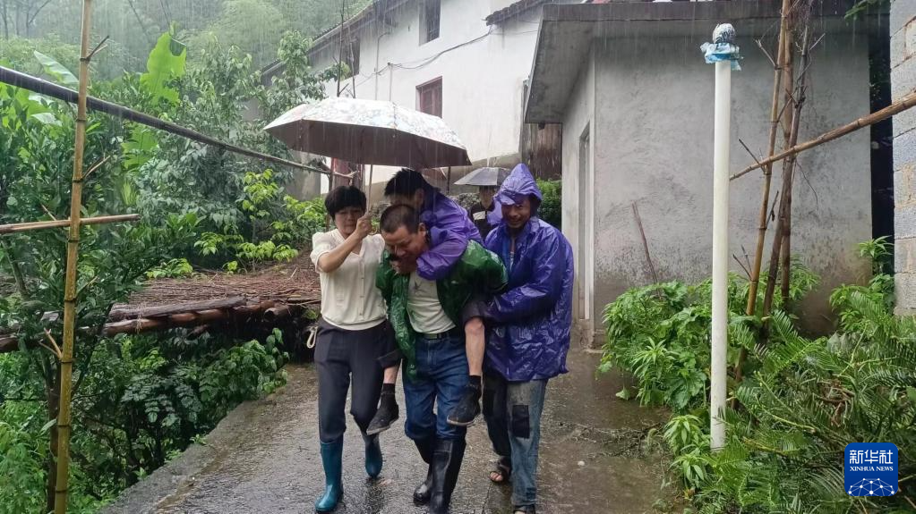 6月19日,在黄山市黄山区新明乡新明村一处滑坡地质灾害隐患点,村干部帮助转移群众。