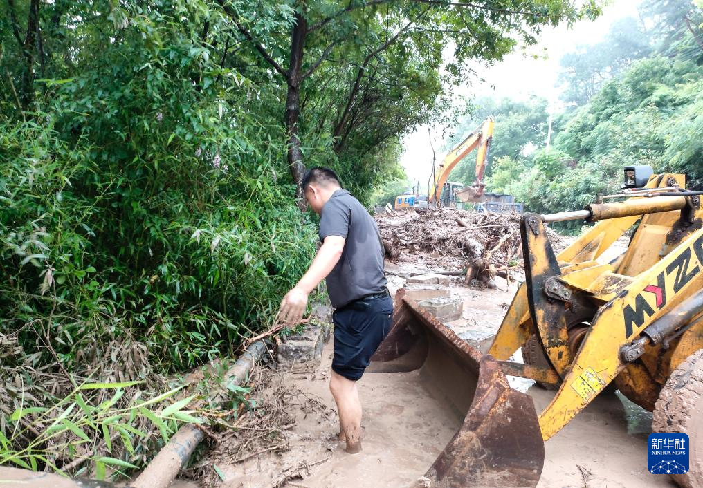 6月20日,在黄山市歙县徽城镇,工作人员用挖掘机阻拦积水道路,防止车辆误入。