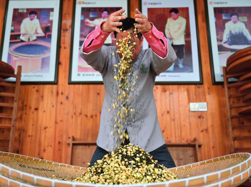 在福州茉莉花茶制茶工坊,福州茉莉花茶传统窨制工艺大师傅天甫进行制茶的第六道工序“窨”(2022 年12 月 16 日摄) 周义摄 / 本刊