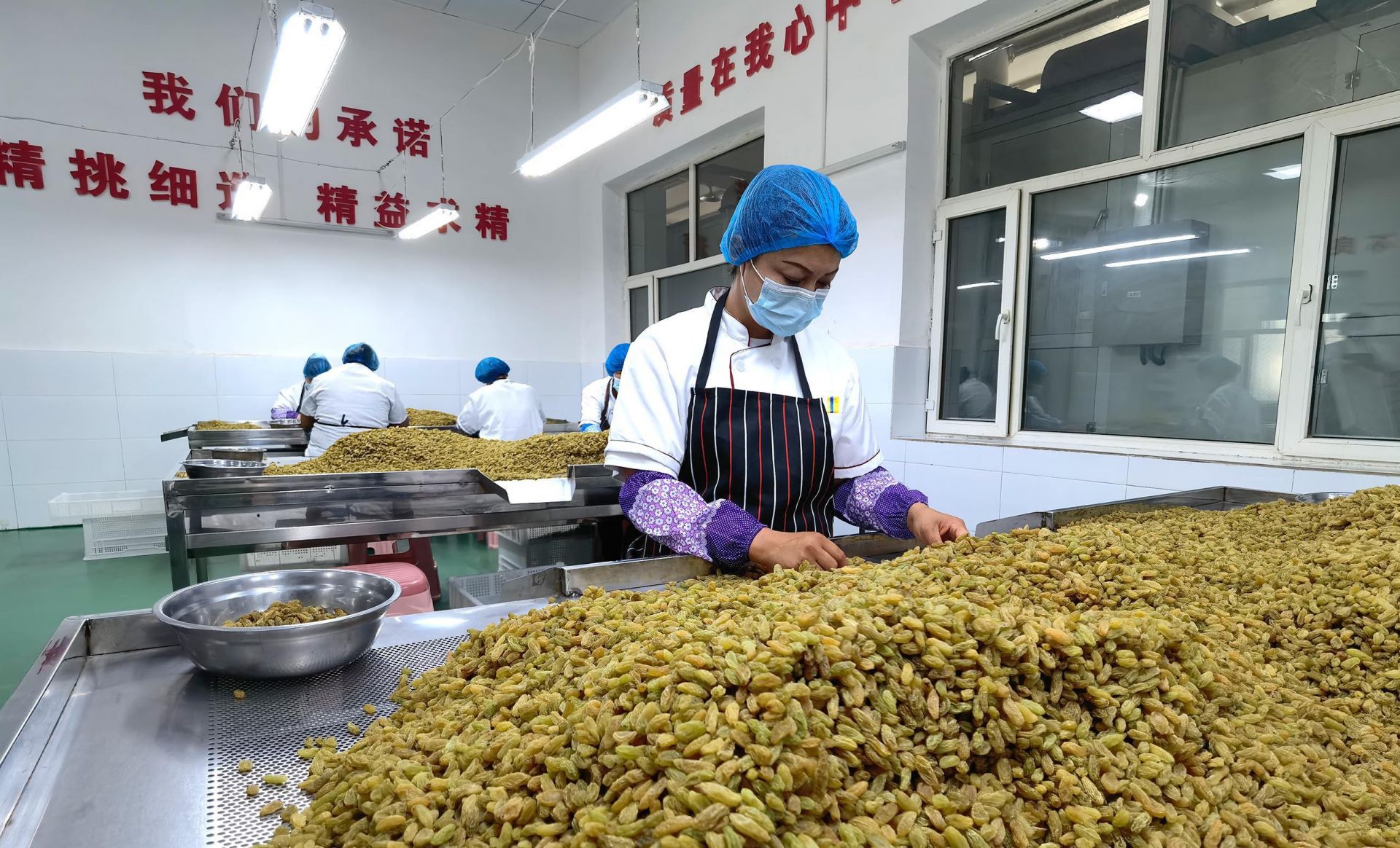 总书记走进厂房。筛选区,村民们灵巧地将葡萄干筛出优劣。葡萄干装箱待发,即将运往大江南北。同总书记交谈时,谈到未来的日子,大家眼里充满希望。