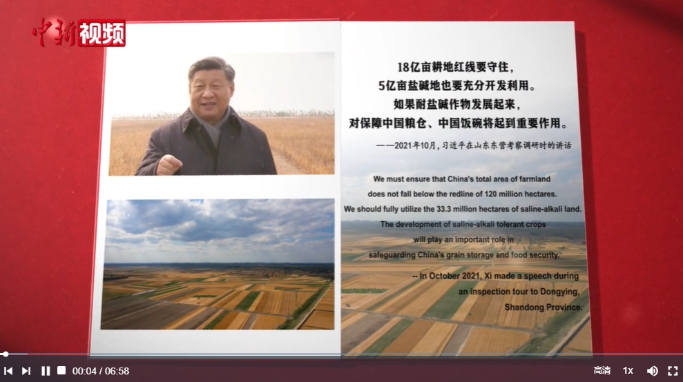 “盐碱地综合改造利用是耕地保护和改良的重要方面”“做好盐碱地特色农业这篇大文章”……中共十八大以来,习近平多次对耕地保护和盐碱地综合改造利用等工作作出重要指示批示。2023年5月,他来到河北省沧州市渤海新区黄骅市,考察盐碱地麦田,了解盐碱地整治、旱碱麦种植推广及产业化情况。这里的土地曾经盐碱化严重,“十年九不收,糠菜半年粮”。如今,当地依靠科技创新,改善土壤,积极培育耐盐碱品种。昔日的盐碱地变成了“渤海粮仓”,种出了乡村新“丰”景,也种出了老百姓的美好生活。